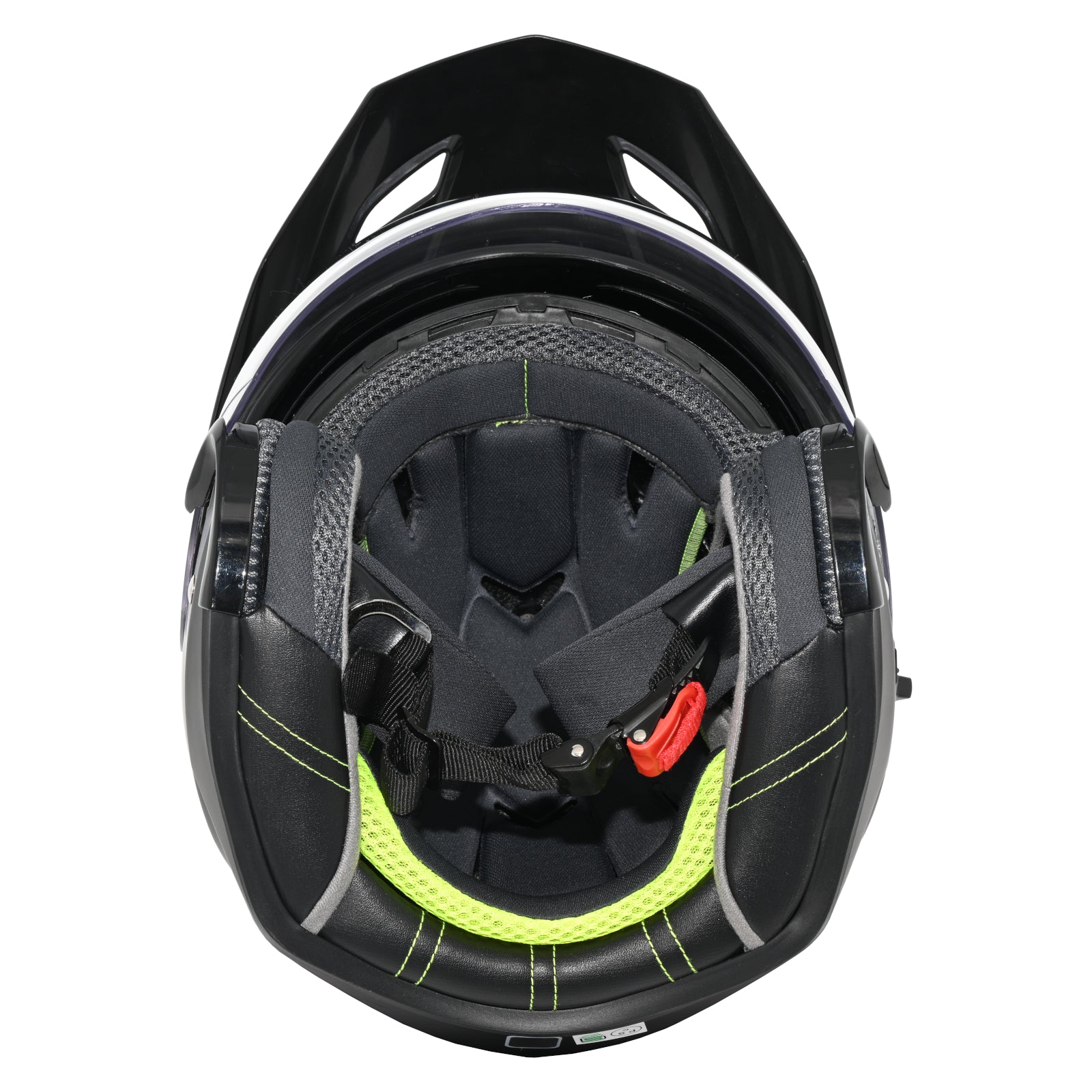 内装はクラウンパッドに速乾性生地、チークには肌触りの良い起毛生地を採用し、長時間でも快適なフィット感をキープ。蛍光イエローのステッチがアクセントになっています。