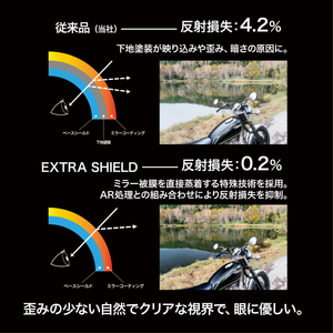 EXTRA SHIELDでは、熟練した職人の手により下地塗装を必要としない特殊ミラー被膜を実現し、純粋にミラー被膜のみを蒸着させている為、視界の歪み、眼精疲労の軽減に成功しました。ミラーコーティングによる紫外線の遮断と相まり、長時間の使用でその効果をより発揮します。