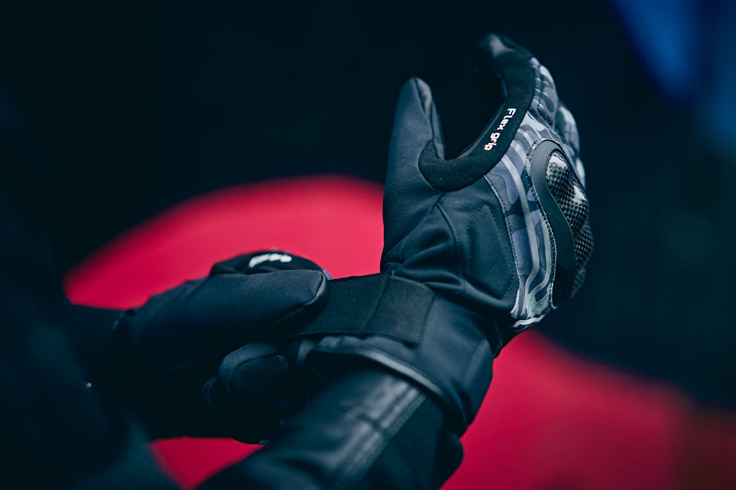 柔らかく摩擦に強い牛革を適所に配置。レーシンググローブで採用されている小指と薬指の付け根を一体化する特別な構造や、甲と掌のカーボンプロテクターで安全性を高めたレーシーなウィンターグローブです。透湿・防水・防風フィルム採用の3レイヤー構造で、雨風の侵入をシャットアウト。中綿は薄く、軽く、温かい高機能素材 "3M™シンサレート™" を採用。非常に柔らかく、肌触りのよいインナー生地を使用し、温かく着け心地のよいグローブに仕上げています。